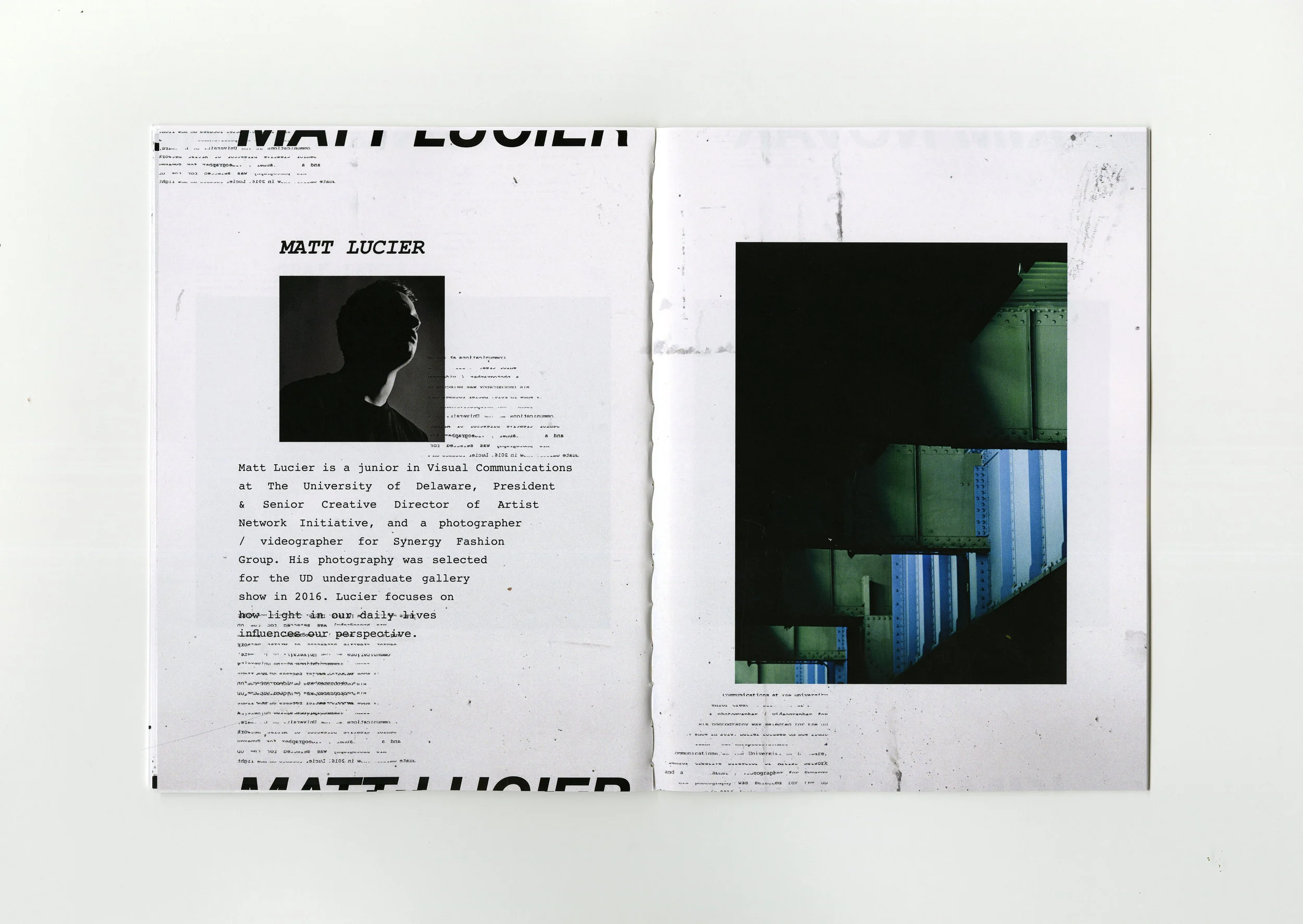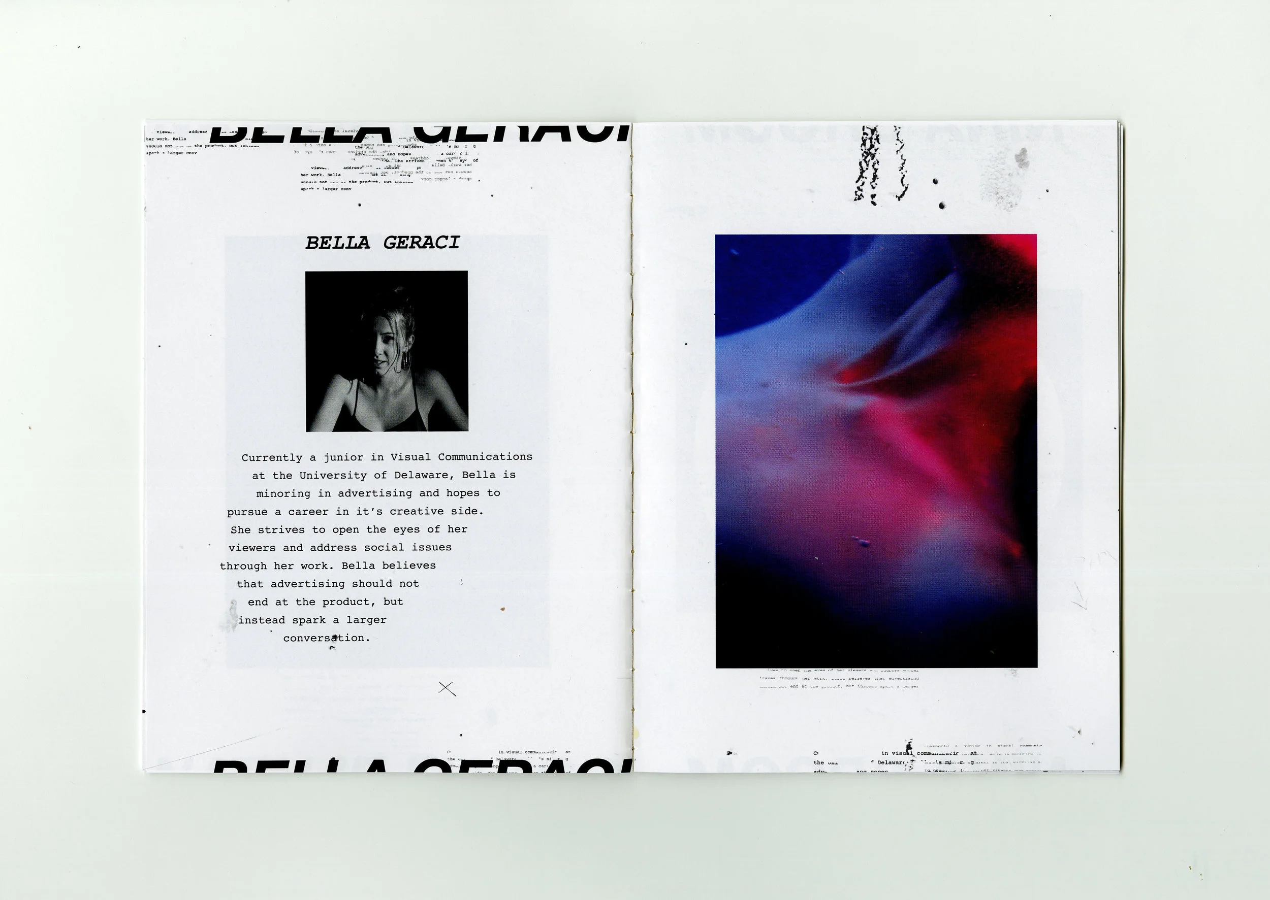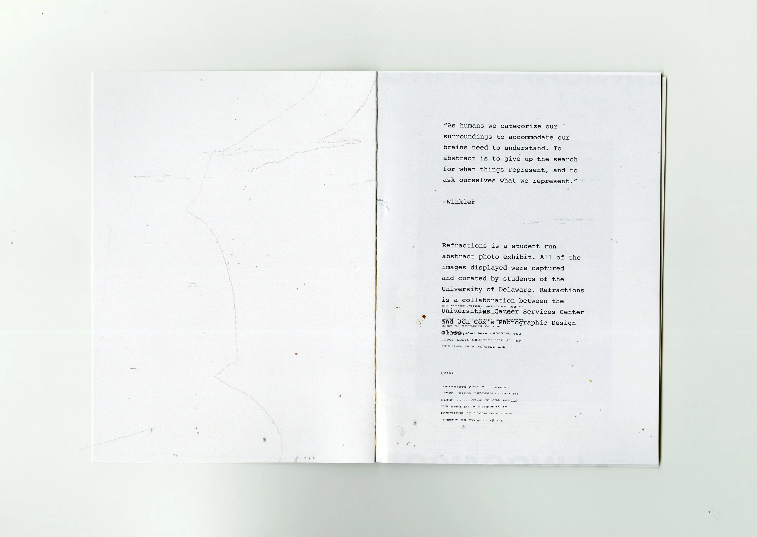 Forty page experimental layout design to accompany an abstract photo exhibition at the University of Delaware. The layout draws textures taken from around the artists' studio space. The body copy is abstracted and mirrors visual aspects of the photo they are paired with.