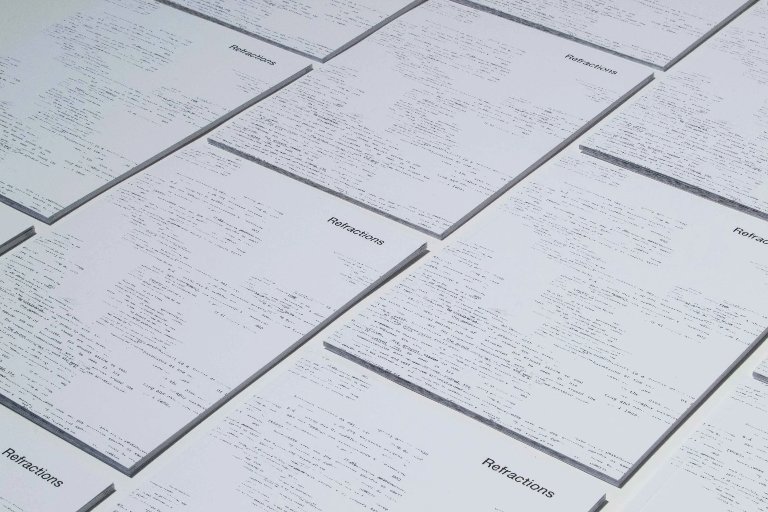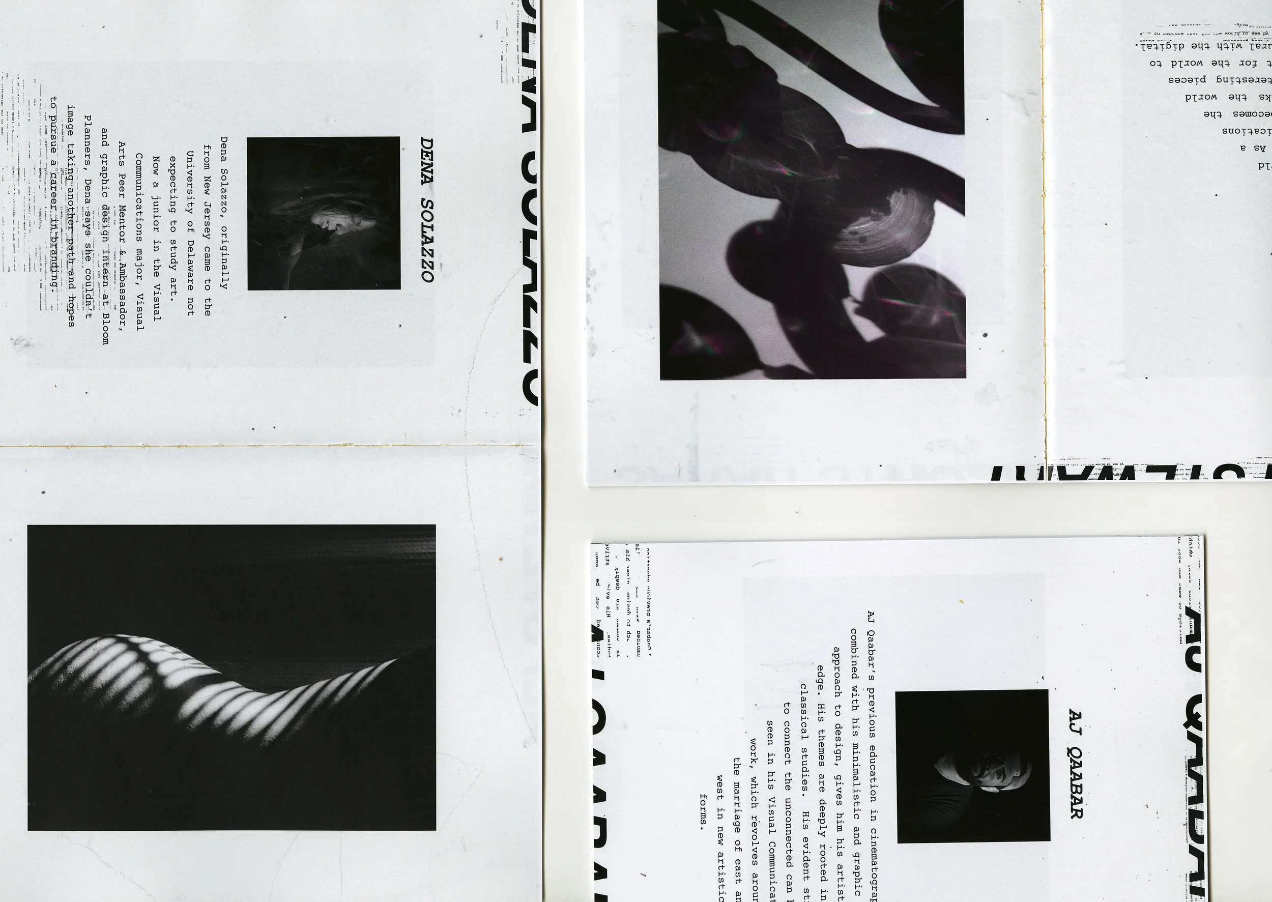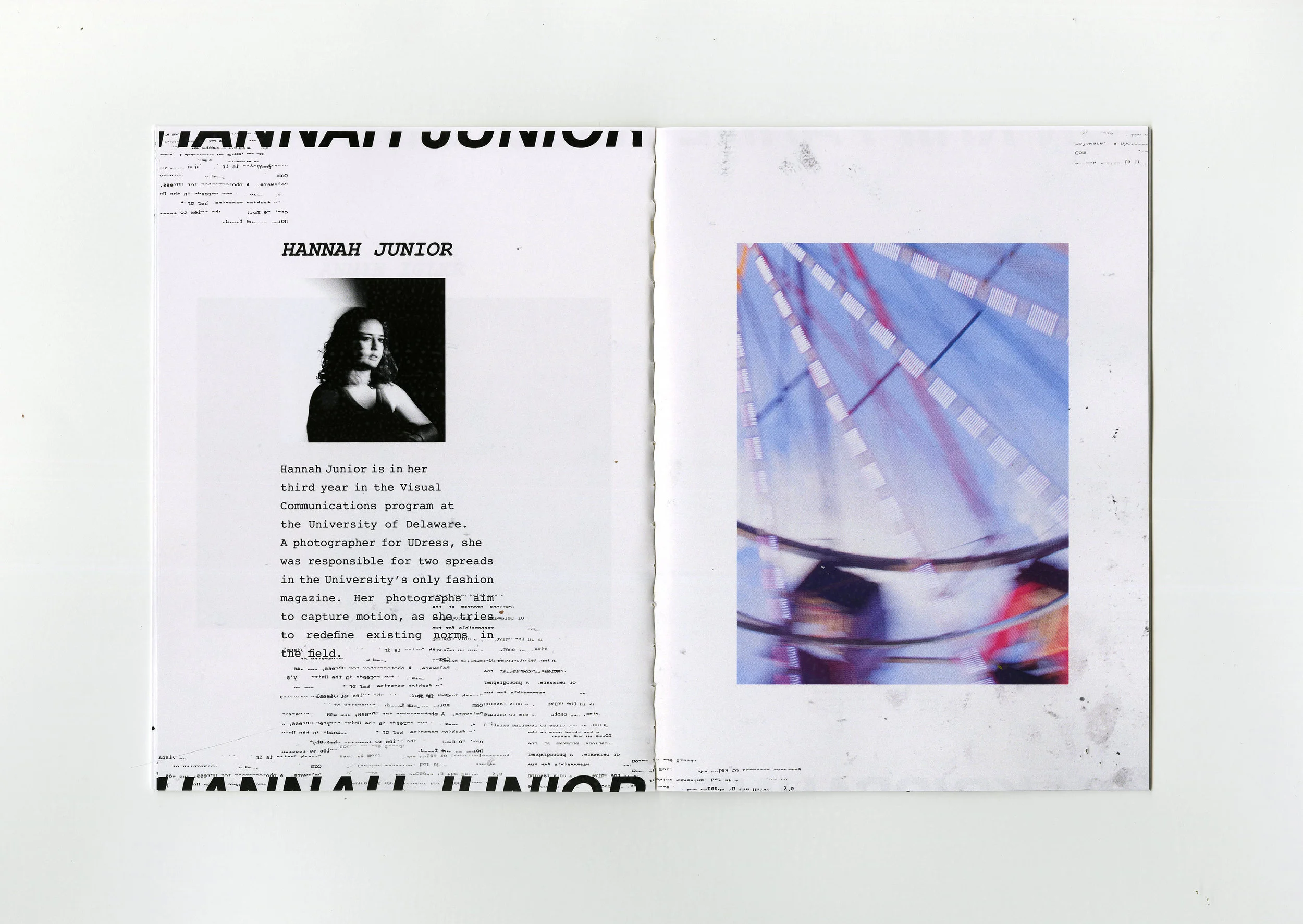 Forty page experimental layout design to accompany an abstract photo exhibition at the University of Delaware. The layout draws textures taken from around the artists' studio space. The body copy is abstracted and mirrors visual aspects of the photo they are paired with.